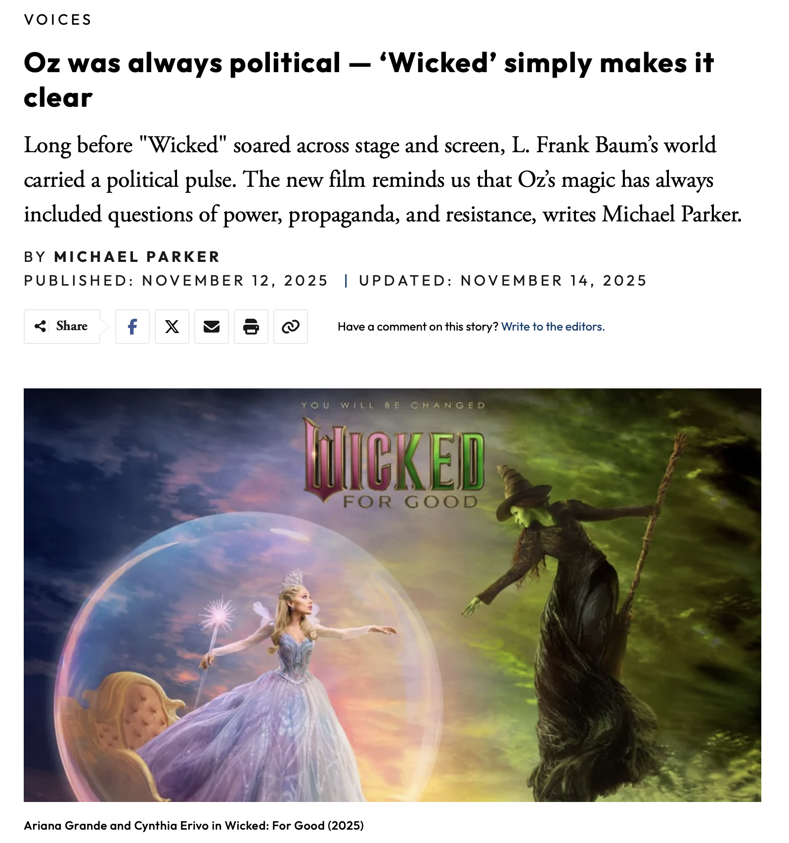“Not simply an elaborate reimagining of a classic tale, “Wicked” is actually a timely political allegory with a disturbingly pointed moral message. The Yellow Brick Road that leads to the Emerald City has often been interpreted to be a path to the American dream, but in “Wicked” it leads to somewhere dreary and foreboding. The fairy tale’s familiar characters become unsettlingly political, mirrors for our own descent into autocracy. But to understand “Wicked” we must first turn to the original Oz story.”